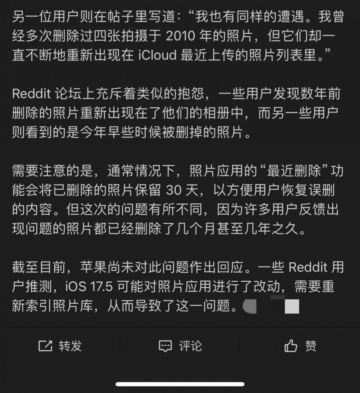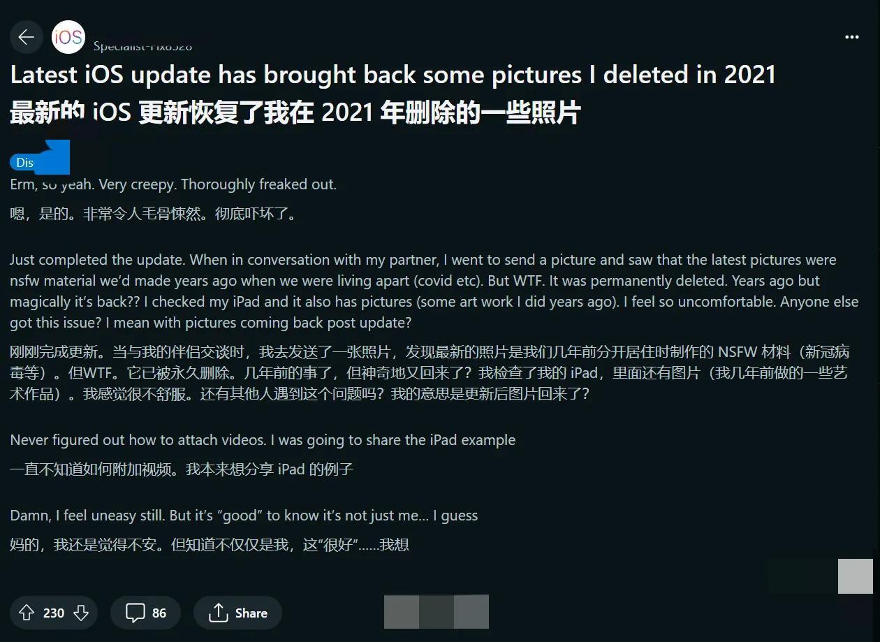 這位網(wǎng)友是這樣描述的,他將IPhone升級到了IOS17.5正式版,方式正在和他現(xiàn)在的伴侶交談,他突然發(fā)現(xiàn)iPhone的照片里出現(xiàn)了幾年前拍攝的,已經永久刪除的照片,而要命的是,這些照片是關于他和之前的伴侶的,非常的隱私,這樣網(wǎng)友表示非常害怕和震驚。