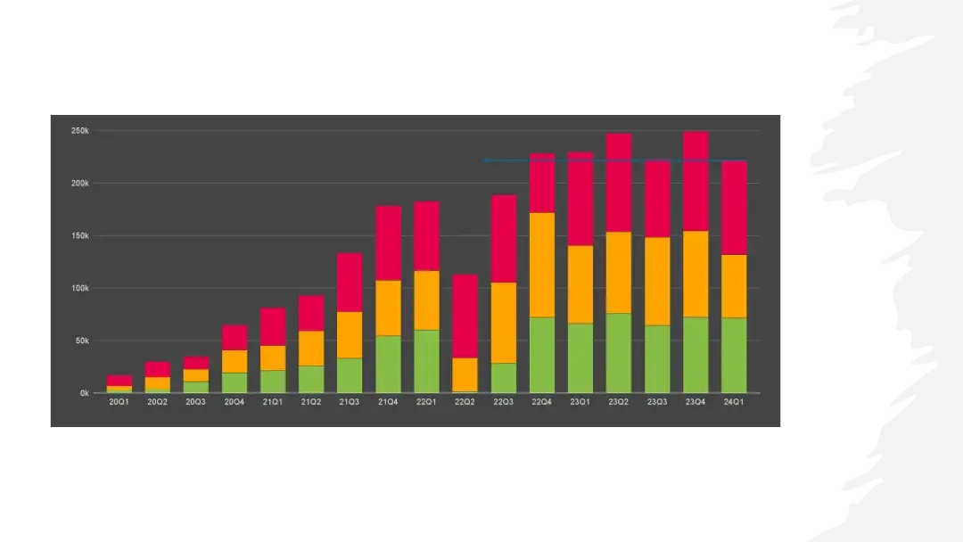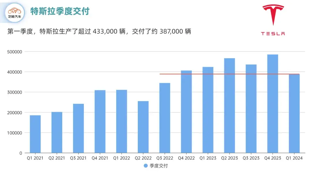 第一季度特斯拉生產了超過 433,000 輛,交付了約 387,000 輛,這個數據是很差的。往前要追溯到2022年的Q3才有這么低。