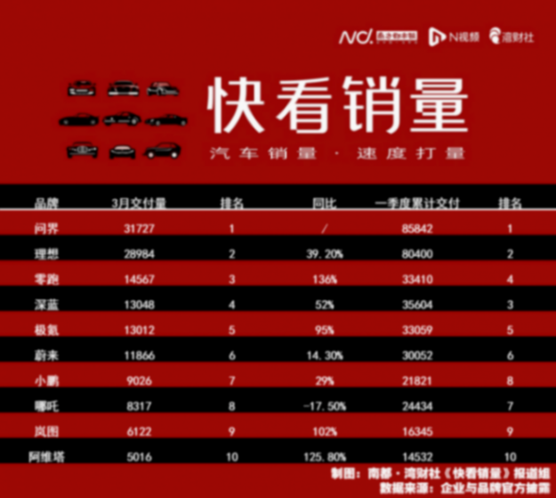 3月新勢力排位變了:問界成大哥,蔚來被擠出前五,哪吒掉隊