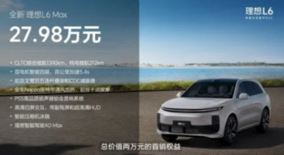 目前理想L6售價格為24.98萬的L6 Pro版和27.98萬的L6 Max版,并且有5000元抵扣10000萬元的權益,此外贈送5000選裝基金以及7kW充電樁,權益方面中規中矩,但是價格確實非常喜人,這也是理想L6訂單爆表的原因,此外高低配的配置差異也刀法精準,頂配車型相較于低配車型多了激光雷達的AD MAX自動駕駛、鉑金音響、車載冰箱等配置,都是一些高階配置,可以滿足不同的消費者。