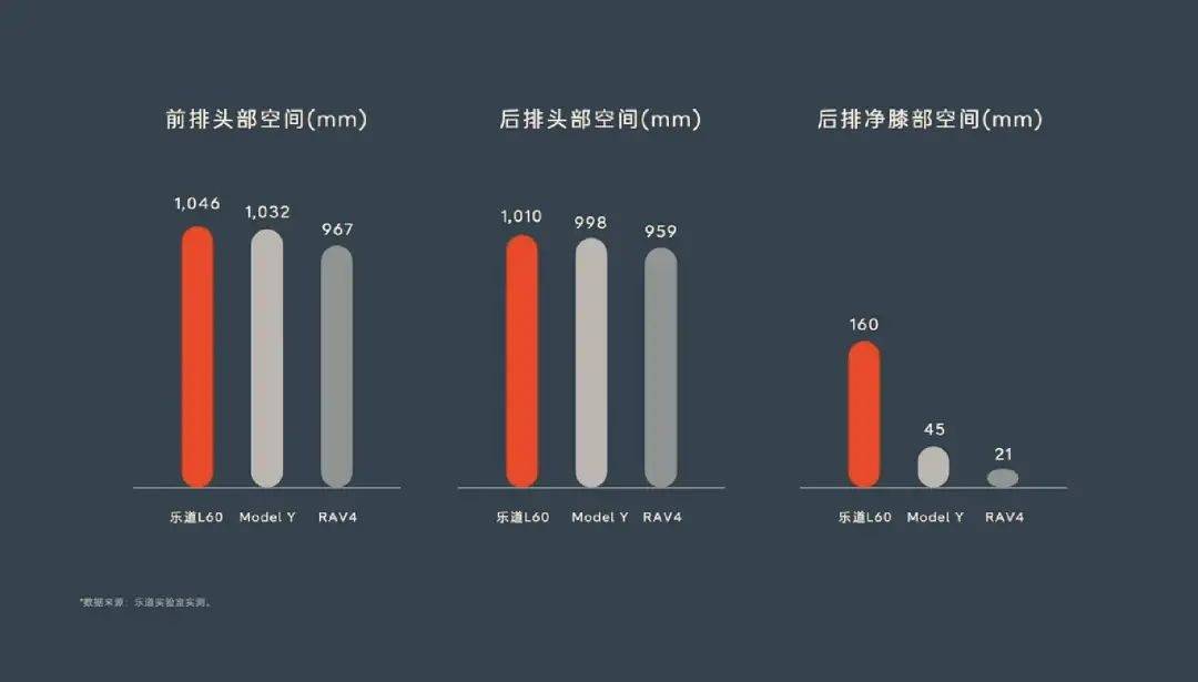 在發(fā)布會現(xiàn)場,樂道對比油車家用車?yán)锏拇鞷AV4和這個價位純電車的標(biāo)桿Model Y,不管是前后排的頭部空間,還是腿部空間,樂道L60都要領(lǐng)先這些對手。