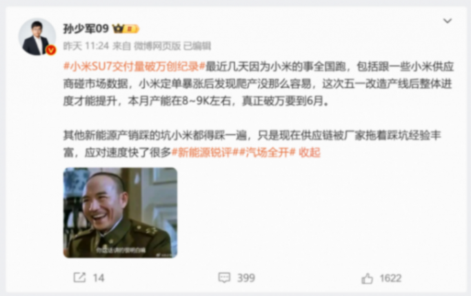 @孫少軍09表示,小米訂單暴漲后發現產能爬坡難度并不容易,這次五一改造產線后,整體進度才有所提升,5月產能在8000-9000輛左右,真正交付破萬還要等到6月份。或許這也在暗示,小米汽車內部對生產進行了調整,盡可能擠出更多產量。