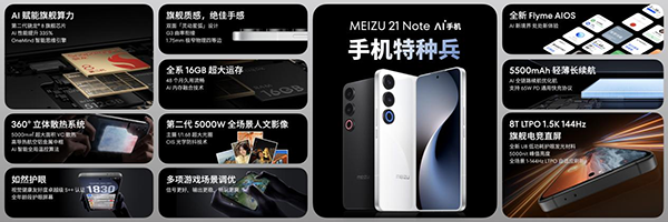 魅族 21 Note則是定位2-3K價位段性能旗艦。性能及配置方面,魅族 21 Note擁有行業唯一白面板以及一體同色黑色磨砂工藝,以及同檔唯一的1.75mm極窄物理四等邊直屏和205g / 8.2mm輕薄機身設計;搭載第二代驍龍 8旗艦處理器,全系16GB LPDDR5X大內存,支持Flyme AI專項性能優化;搭載5500mAh超大電池,66W有線超充及支持65W PD通用快充協議。
