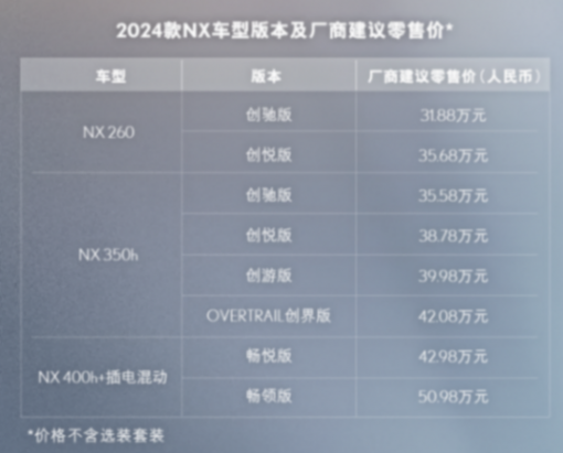 新車基于豐田GA-K平臺打造,提供三種動力總成,NX260搭載的是2.5升自然吸氣發動機,最大功率為149千瓦,峰值扭矩240牛·米,匹配8擋手自一體變速箱;NX 350h搭載2.5L油混動力,發動機最大功率139千瓦,綜合功率179千瓦,匹配E-CVT變速箱;NX 400h+搭載2.5L插混動力,綜合功率195千瓦,匹配三元鋰電池組,WLTC純電續航里程有73km和76km可選。