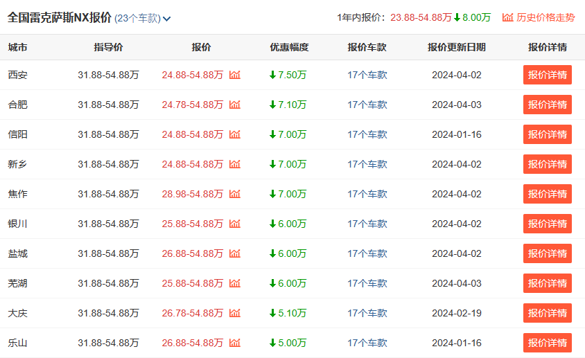 值得一提的是,從汽車平臺上的報價來看,部分地區2023款雷克薩斯NX最高優惠達到7.5萬元。也有網絡上的銷售人員表示,若選擇分期方式購車,可享受現金優惠8萬元,換算下來入門款售價甚至比豐田RAV4榮放還要便宜。