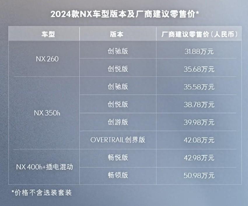 豐田,作為世界最大的汽車制造商之一,可以說是無人不知無人不曉的存在,其中,雷克薩斯,作為豐田旗下的高端汽車品牌,更是一度成為了眾多車迷朋友們的購車首選品牌,畢竟,不管是在省油耐用還是品質方面,雷克薩斯旗下車型均有著較為不錯的表現。近日,小編從雷克薩斯官方獲悉,2024款雷克薩斯NX正式迎來了上市,官方指導售價區間為:31.88萬元-50.98萬元,為了滿足不同車迷朋友們的購車需求,新車提供3種動力形式可選(插電混動/油電混動/純燃油),作為一款豪華中型SUV,對于該車這樣的價格區間,不知道你們是否還滿意呢?下面就跟隨小編一起來詳細了解一下吧。