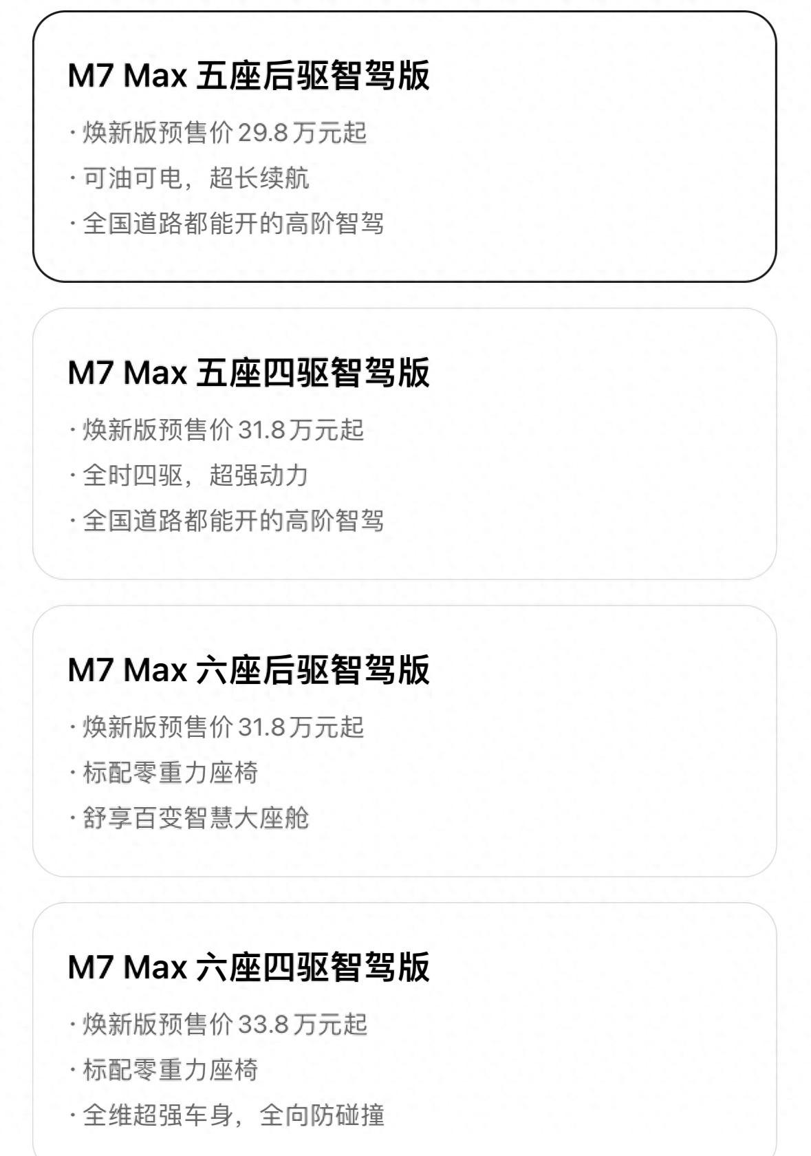 5月17日,AITO問界新M7 Max煥新版正式開啟預定,新車共推4款車型,預定價為29.8萬元-33.8萬元,提供五座/六座兩種座椅選擇,以及后驅/四驅兩種驅動形式選擇,全系均將提供華為高階智駕。目前小訂,可享受1000元抵扣2000元尾款減免權益,新車將于5月31日正式上市。