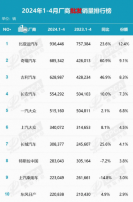 3月份以來,在多款榮耀版新車的推動下,比亞迪月銷量已經連續兩個月突破了30萬臺。按照這一勢頭,比亞迪5月份繼續穩定在30萬+基本沒有懸念。1-4月份,比亞迪累計銷量已經達到了93.64萬輛,足足領先第二名奇瑞汽車超過25萬臺,而相比于合資車企,比亞迪的累計銷量更是已經超過了南北大眾、南北豐田的銷量總和。