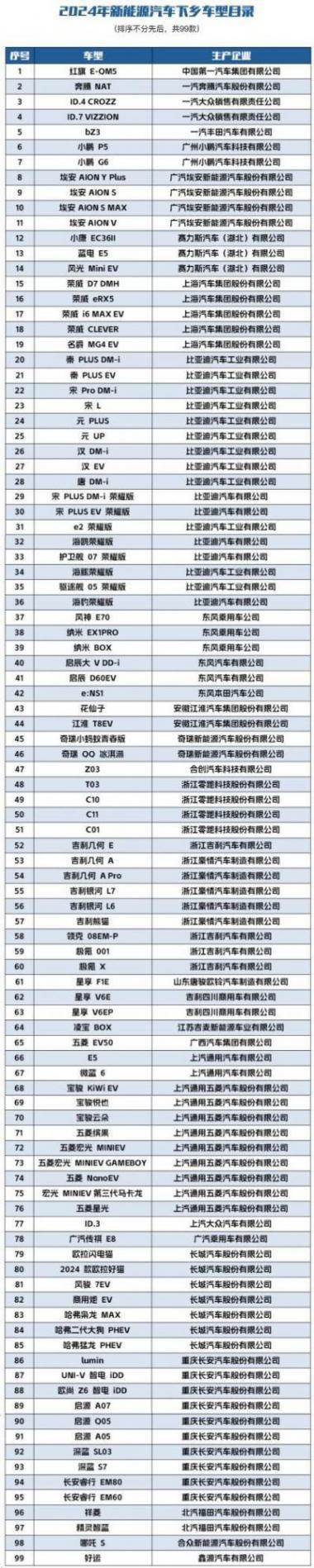 根據2024年新能源汽車下鄉車型目錄,今年新能源汽車下鄉車型總規模為99款,其中比亞迪就占據了17款,秦PLUS DM-i/EV,宋Pro DM-i、宋PLUS DM-i/EV,元PLUS,驅逐艦05榮耀版等多款銷量主力車型,均將參與本輪新能源汽車下鄉。