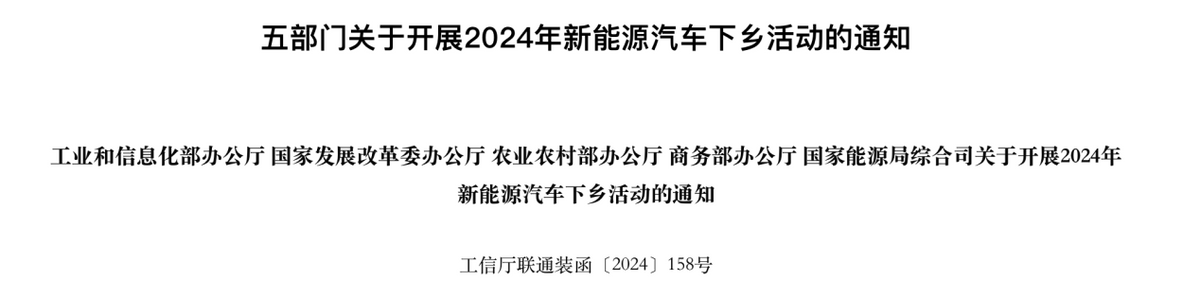 而除了新車,最值得一提的還有下沉市場帶來的新增長機遇。5月15日,《開展2024年新能源汽車下鄉活動的通知》正式出爐,根據《通知》,從5月份到今年12月份,國內車市將開啟2024年新能源汽車下鄉活動。