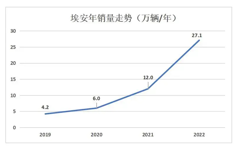 而根據(jù)公開的數(shù)據(jù)顯示,廣汽埃安 2019 年、2020 年、2021 年、2022 年銷量分別達(dá) 42,003 輛、60,033 輛、120,155 輛、271,156 輛——幾乎每年都是翻倍式的增長。