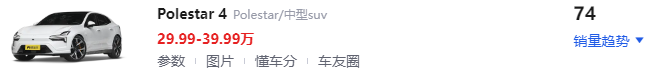 第二臺新車沃爾沃極星4,造型設計非常帥,內(nèi)飾的質(zhì)感很好,配置也很豐富,它的駕控體驗感超過大部分車型,但是上個月只交付了74臺車,還不到三位數(shù)。售價起步29.99萬,頂配39.99萬,上市了四款車型,提供兩驅(qū)版四驅(qū)版可以供你選擇。相對于老款,售價已經(jīng)下調(diào)5萬到13.3萬,沃爾沃汽車還是比較明智的!