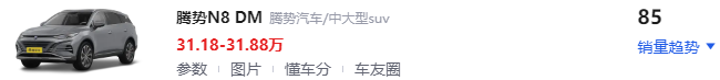 第三臺新車騰勢N8,多好的一臺車,做工品質(zhì)非常高,配置比較豐富,綜合油耗也只5升左右,綜合續(xù)航里程超過1,100公里,而且純電續(xù)航里程提供是215公里,電機馬力就有490匹,在混動模式下最大功率是452千瓦。以這樣的綜合實力表現(xiàn),但是上個月只賣出85臺車,真的是非常可惜!