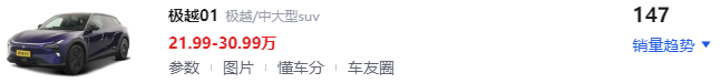 第四臺新車吉利極越01,它由極度汽車改名而來,上個月只交付了147輛,這個銷量成績真的是非常一般!指導價起步21.99萬,頂配30.99萬,上市了三款車型,相對老款售價已經(jīng)下調(diào)3萬,雖然價格便宜了,但是依舊賣不動!車身長度4.85米,寬度1.99米,軸距是3米左右,車身重量達到2.2噸。