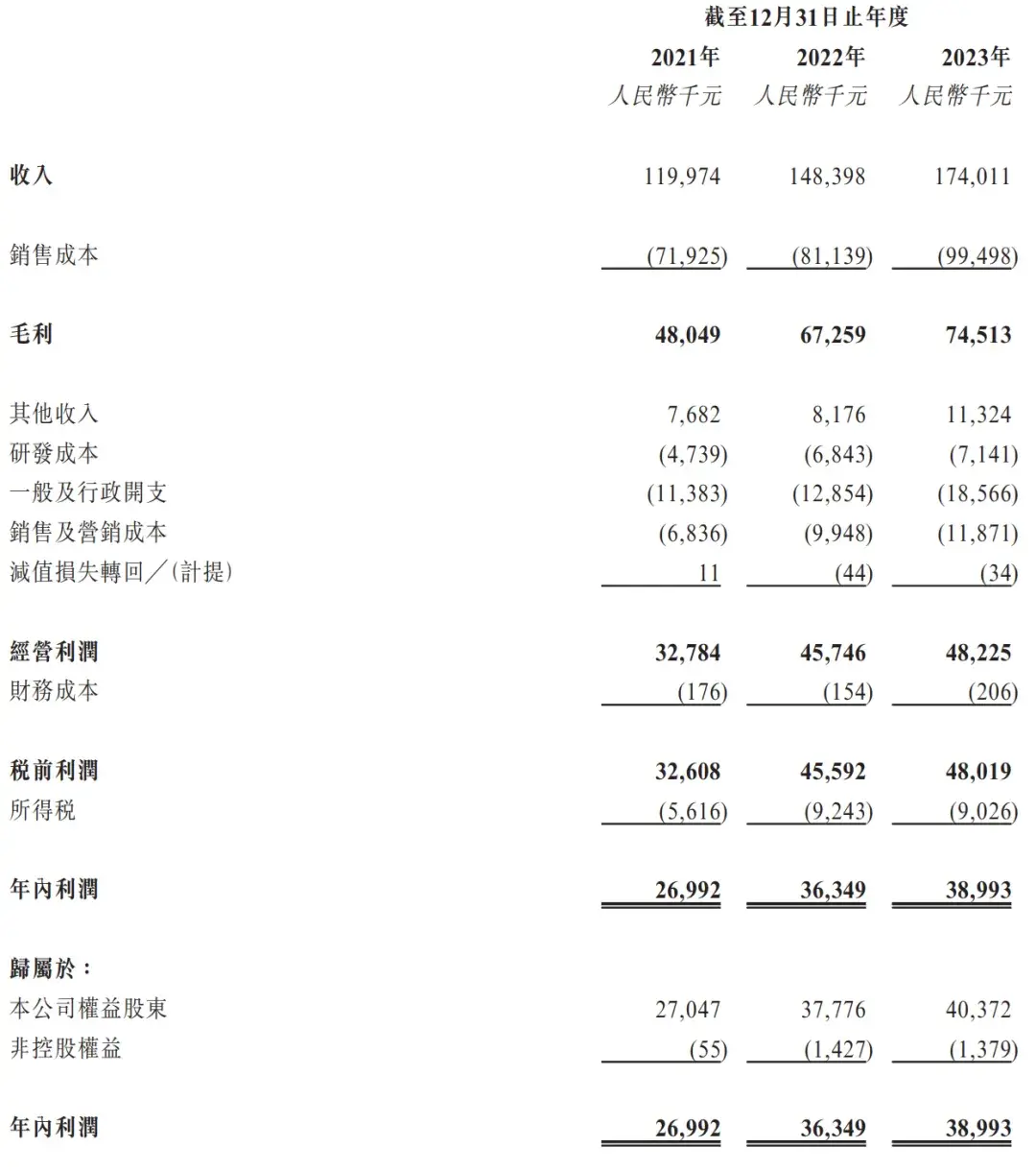 眾淼創新2021年、2022年、2023年經營利潤分別為3278萬元、4575萬元、 4822.5萬元;年內利潤分別為2699萬元、3635萬元、3899萬元。