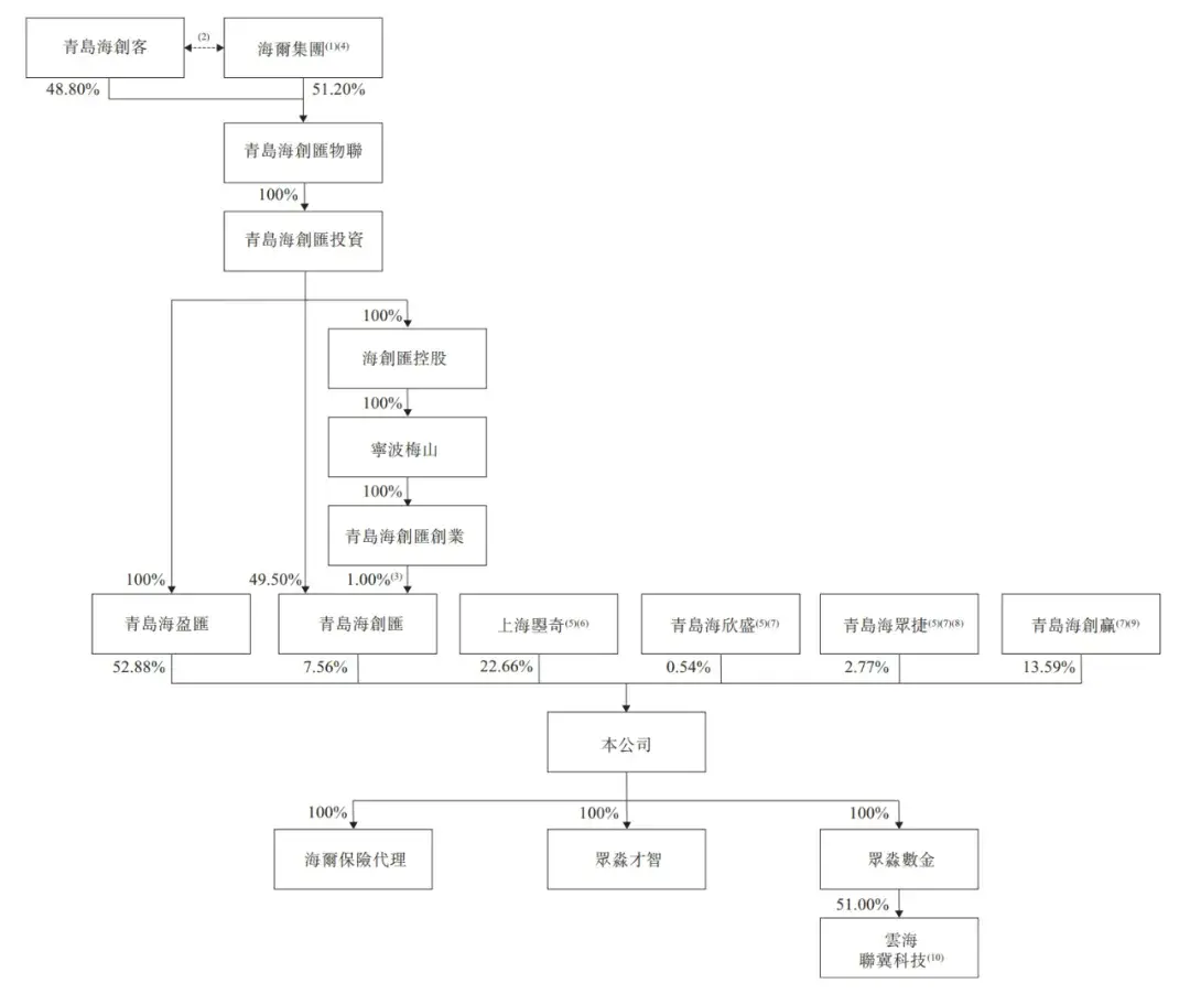 IPO前,青島海盈匯持股為52.88%,青島海創匯持股為7.56%,上海曌奇持股為22.66%,青島海欣盛持股為0.54%,青島海眾捷持股為2.77%,青島海創贏持股為13.59%。