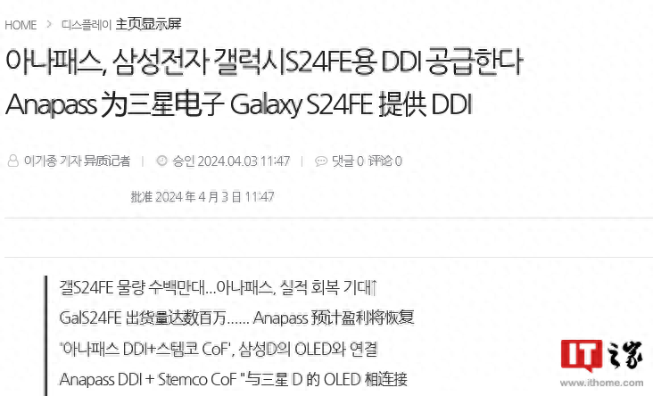 月 4 日消息,韓媒 The Elec 近日發布報道,稱韓國 Anapass 公司已經為三星 Galaxy S24 FE 提供面板顯示驅動芯片(DDI),且初期備貨數百萬臺。