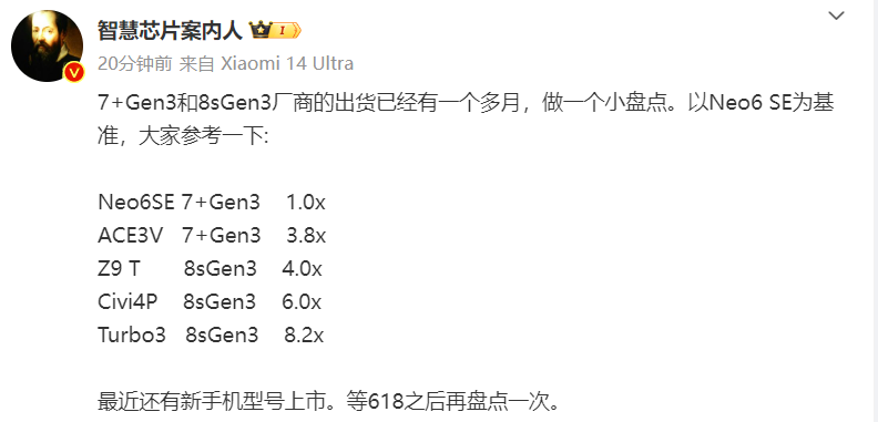 最近博主智慧芯片案內(nèi)人對(duì)真我GT Neo6 SE、一加Ace 3V、iQOO Z9 Turbo、小米Civi 4 Pro和紅米Turbo 3這幾款機(jī)器的出貨量做了個(gè)小盤點(diǎn),可以看到采用驍龍7+ Gen3的兩款機(jī)器加起來也就4.8個(gè)基準(zhǔn)量,而采用驍龍8s Gen3的三款機(jī)器加起來有18.2個(gè)基準(zhǔn)量。