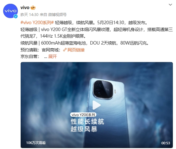 此外,vivo官方近日宣布將于5月20日 14:30 發布vivo Y200系列新機。