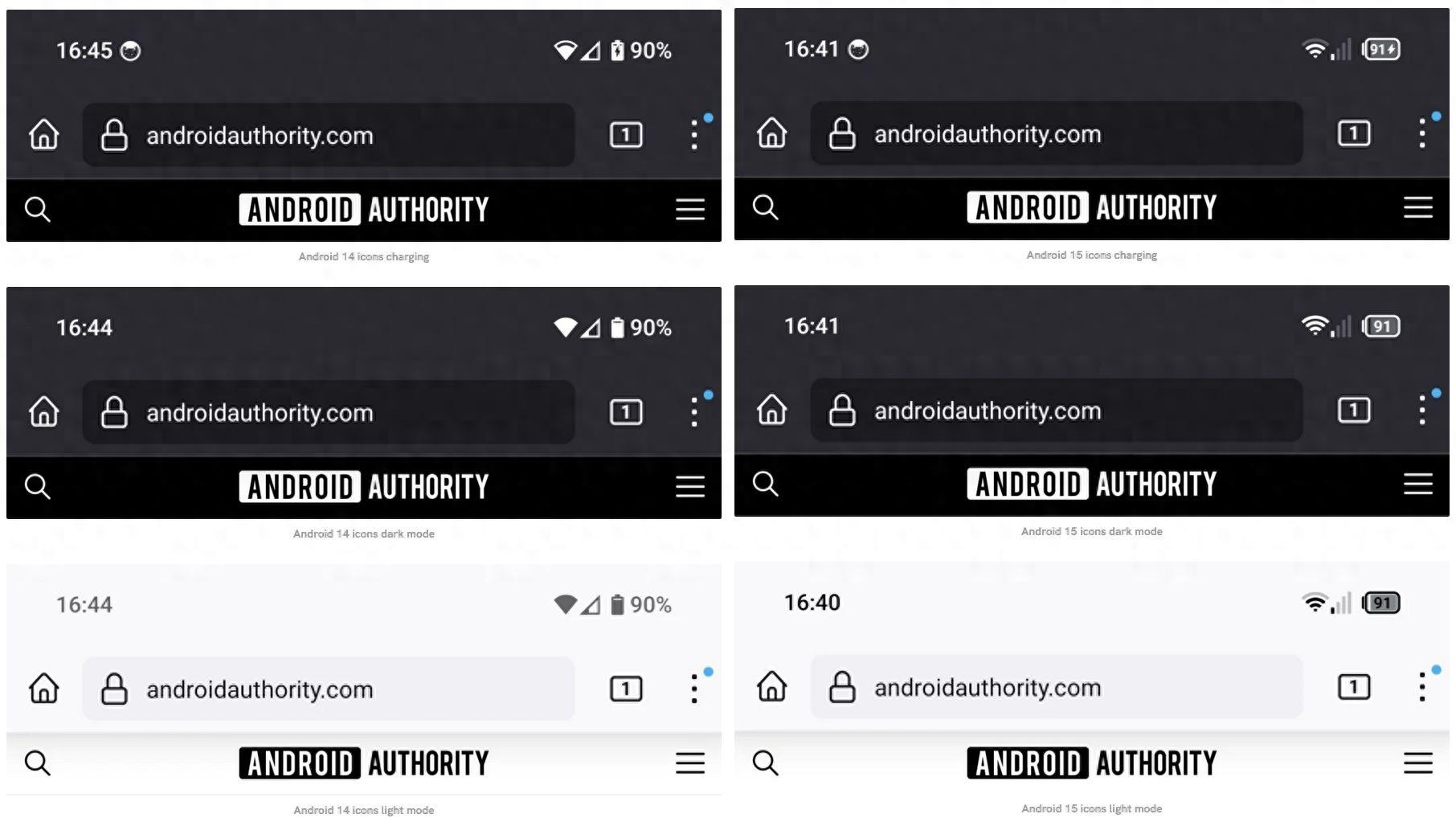 以下截圖展示了安卓 15 中新的狀態欄圖標設計,包括 Wi-Fi 信號強度、移動數據信號強度和電池電量,同時支持亮色和暗色模式。
