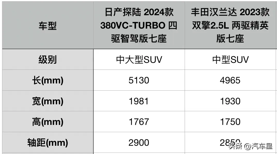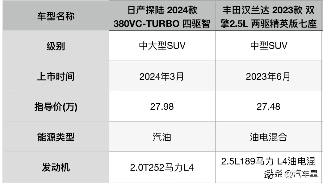 選擇指導價相近的兩款車,日產探陸 2024款380VC-TURBO 四驅智駕版七座(指導價27.98萬)和豐田漢蘭達 2023款 雙擎2.5L 兩驅精英版七座(指導價27.48萬),指導價相差5000元。