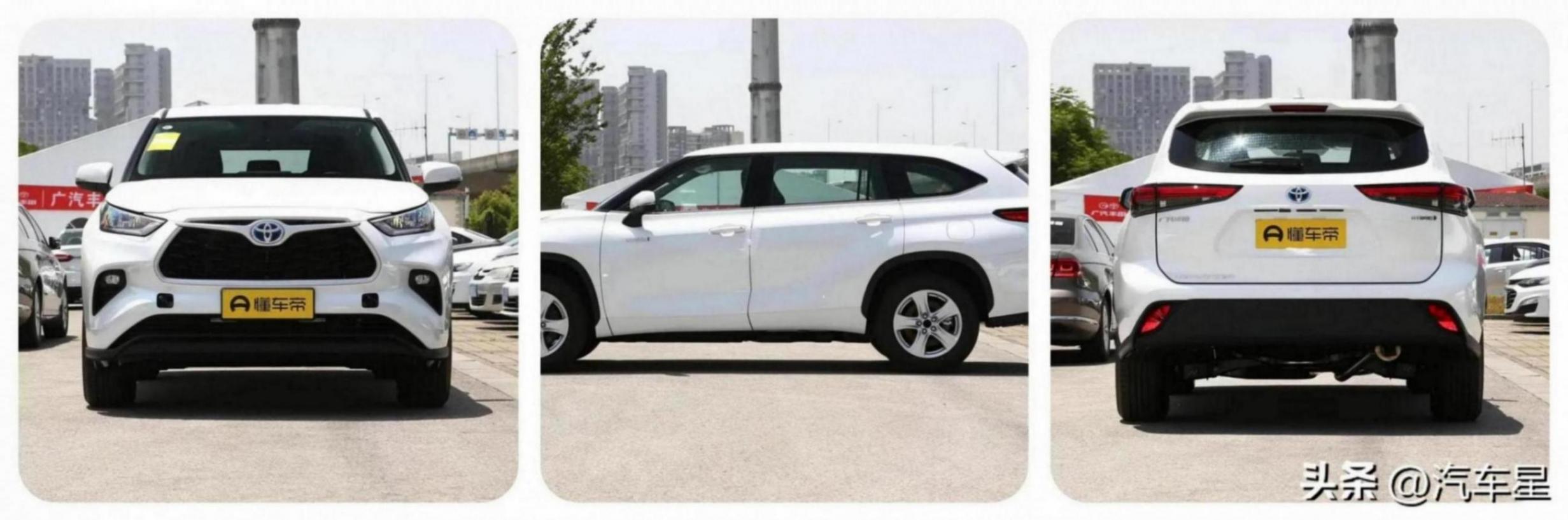 豐田漢蘭達,整體設計加入的線條比較多,力量感明顯,車頭兩側大燈使用銀色鍍鉻亮條進行連接,立體感不錯,車身造型干練,尾燈組左右對稱,中間藍色車標彰顯其混動身份。