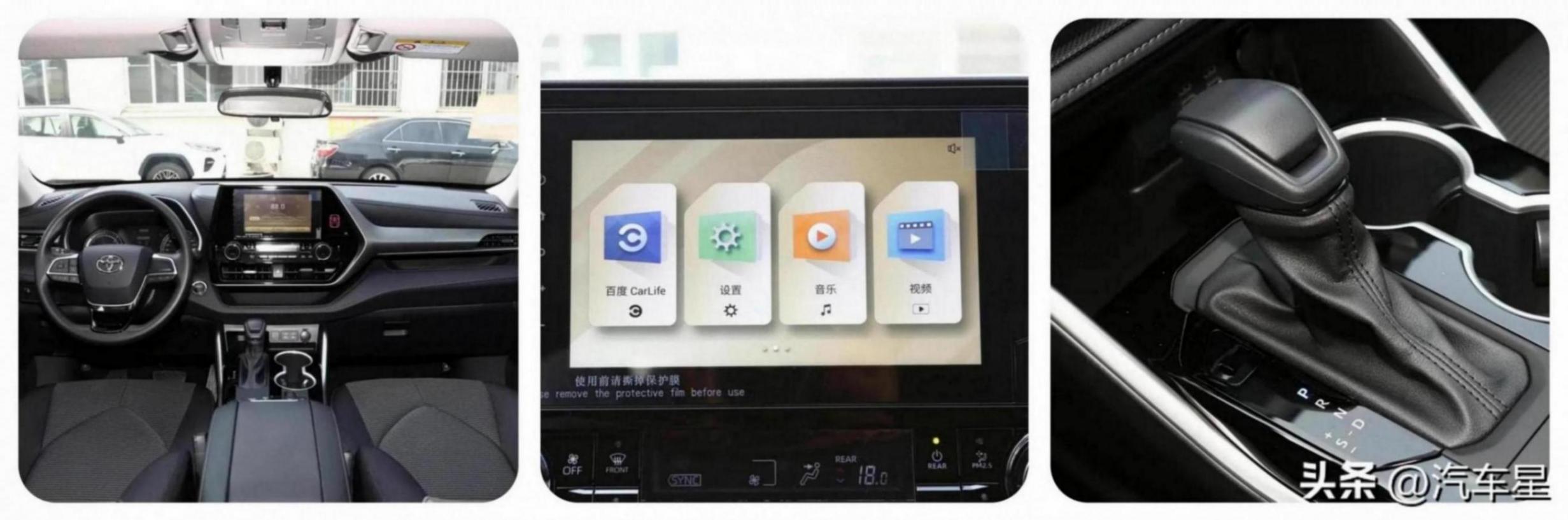 豐田漢蘭達呈現Y字型布局,中控臺棱角分明,主要以黑色為主顯得干練,中控與車門內側加入了軟性皮革和光亮飾板,座椅采用織物材質,塑料方向盤支持上下+前后移動功能。
