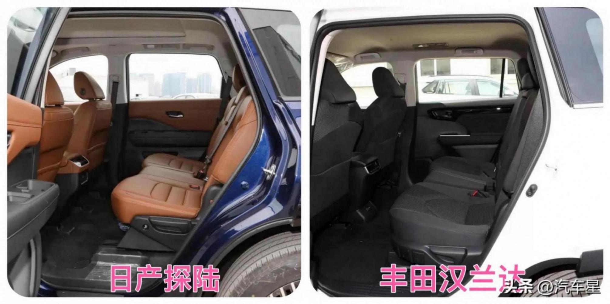 日產探陸是真皮座椅,豐田漢蘭達是織物的,都擁有主駕駛座椅前后移動、高低調節和靠背角度調節,副駕駛座椅前后移動和靠背角度調節,日產探陸多了主副駕駛座椅電動調節,前排座椅加熱功能。
