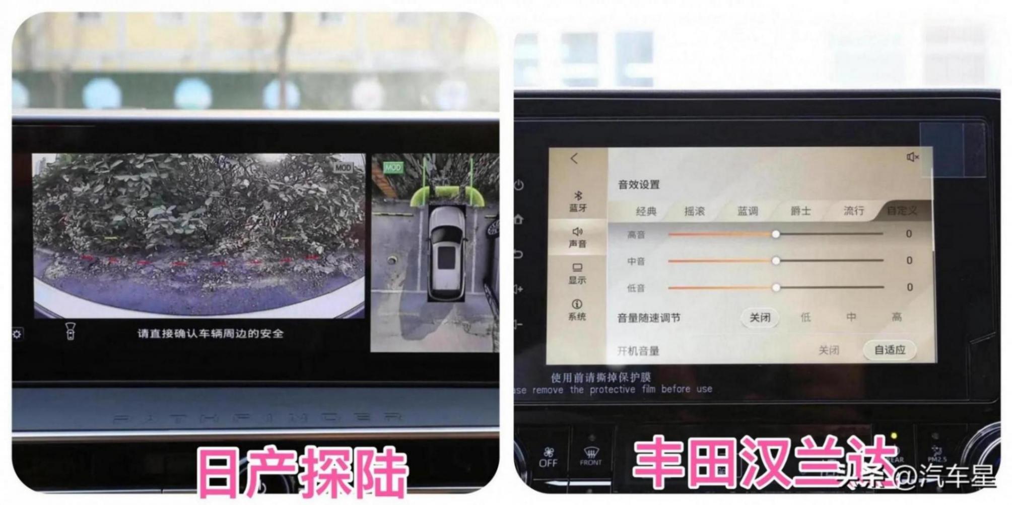 小結:兩款車的車機功能都有道路救援服務、藍牙車載電話、手機互聯映射功能,日產探陸多了GPS導航系統、AR實景導航、車聯網、OTA升級、語音識別控制系統,豐田漢蘭達多了手機互聯映射CarPlay、CarLife和HiCar功能,因此日產探陸的車機要豐富一些,而在內飾用料方面,日產探陸內部加入的皮質材料比較多,質感細膩,而豐田漢蘭達座椅是織物的,透氣性明顯。
