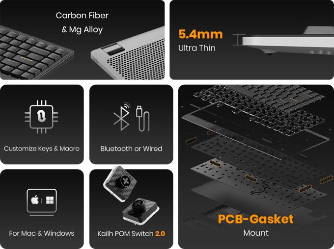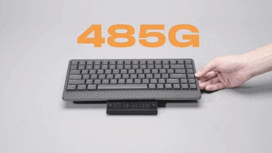 這款鍵盤采用定制凱華矮軸(2.4mm 行程)、碳纖維材質(zhì)面板、PBT 熱升華鍵帽、鎂合金底殼,尺寸為 318x154.5x16.46mm,最薄處只有 5.4mm,重 485g,號稱是全球最輕薄的矮軸鍵盤。