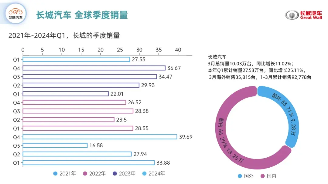 長城汽車3月總銷量10.03萬臺,同比增長11.02%;本年Q1累計銷量27.53萬臺,同比增長25.11%。