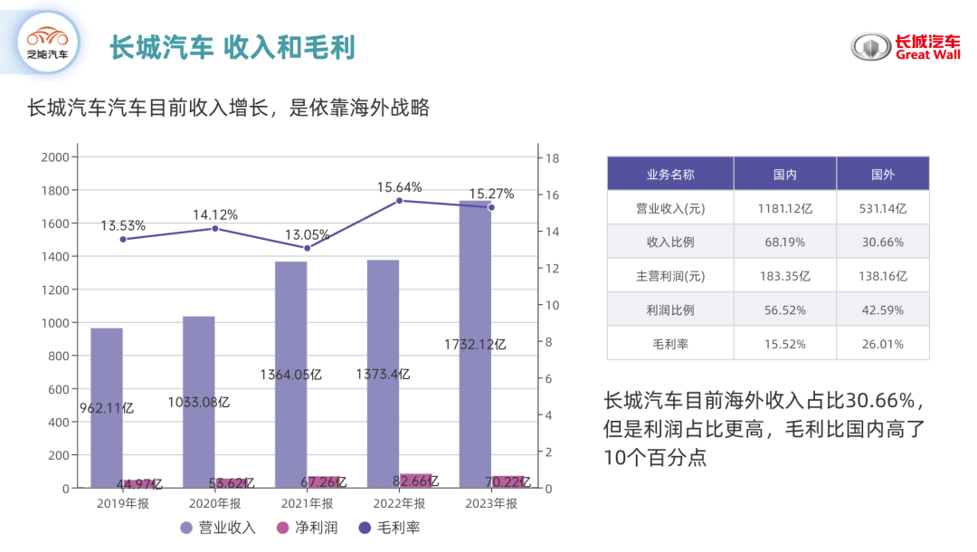需要注意的是,長城已經確認了長期發展要靠國外。2023年里面如果拆分,在國內的收入1181億,毛利率15.52%,而國外業務531億,毛利率26%。