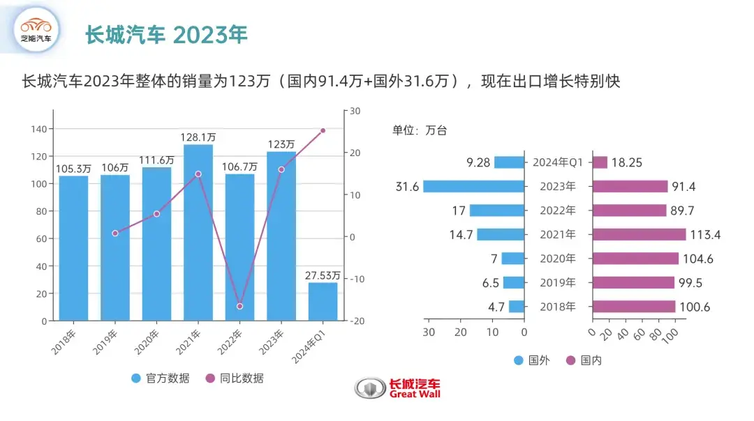 2023年,長城汽車全年實現銷量123萬輛(國內91.4萬+國外31.6萬),同比增長15.85%;