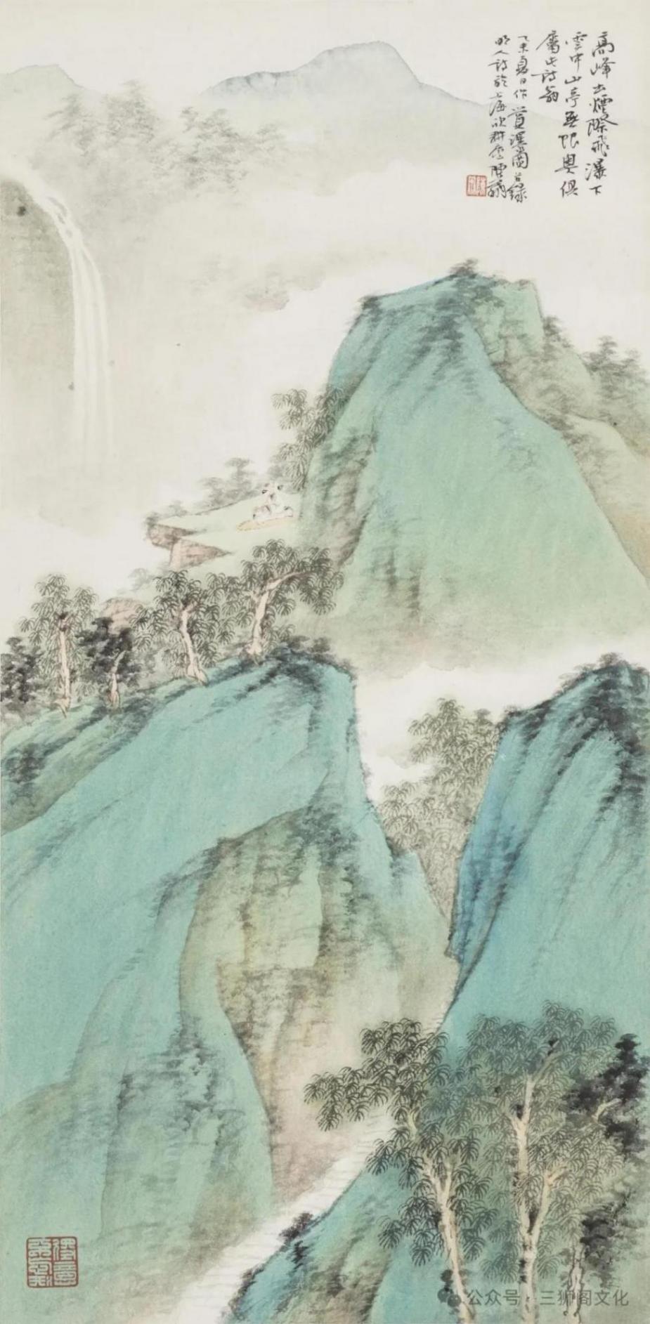 陳翔是上海美術(shù)家協(xié)會(huì)副主席,他的青綠山水,典雅含蓄,筆法簡潔,深得文人畫韻味。《博學(xué)》展出了6件陳翔的山水畫,展現(xiàn)了他的藝術(shù)特征。青綠山水在宋代獲得充分發(fā)展,明清之際,水墨山水成為主流,青綠山水的作者不多。陳翔的青綠山水,沒有被青綠設(shè)色的技法困擾,每一件作品中,都透出“有骨骼”的精神,是當(dāng)今難得的境界。