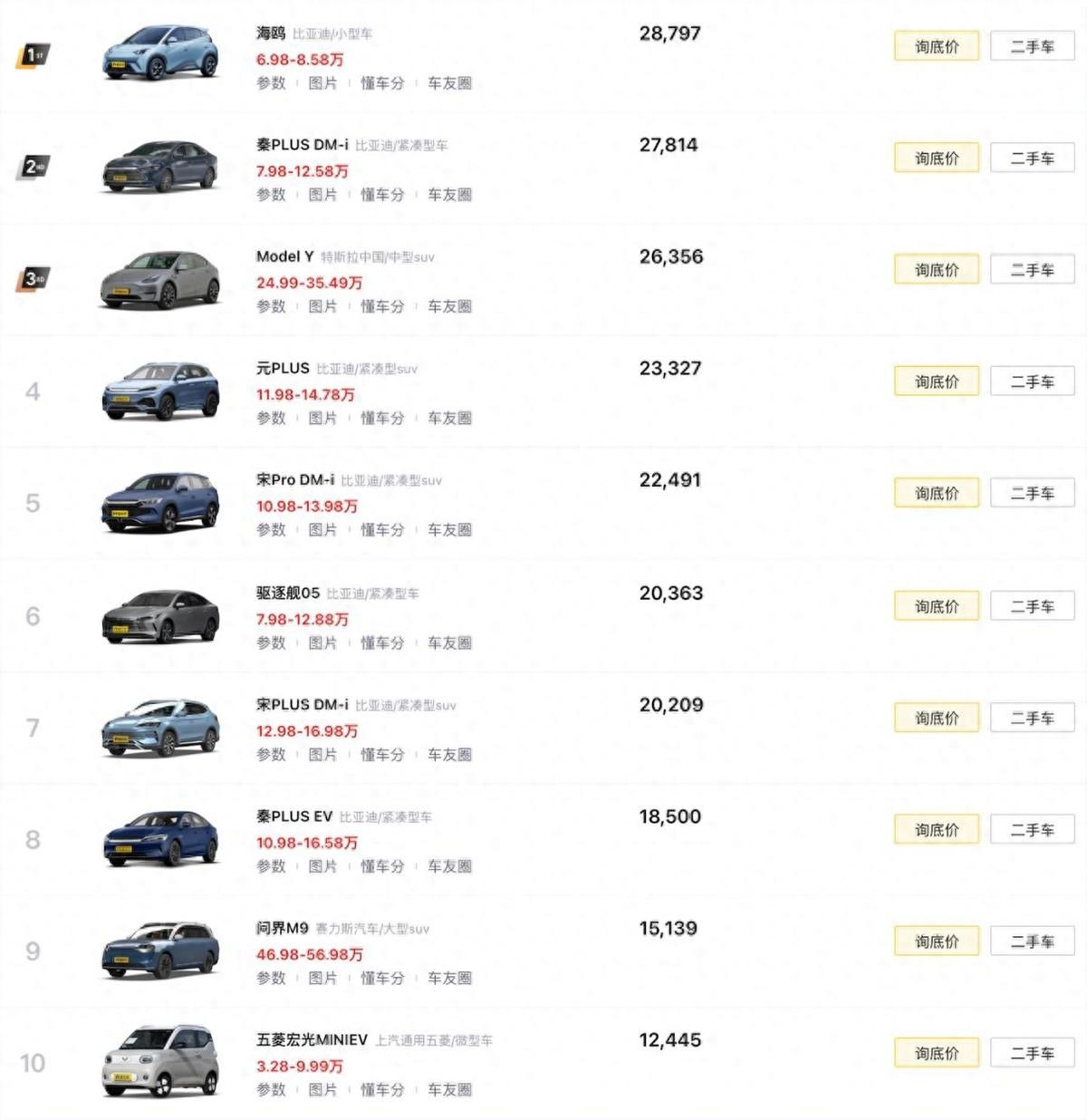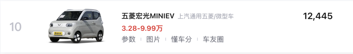 隨著比亞迪、吉利、長安等品牌打響新能源家轎車的新一輪“價格戰”,像五菱宏光MINIEV(第10名/3.28-9.99萬元)這類降無可降,甚至在更新中漲價的純電通勤車,已經逐漸失去競爭優勢。畢竟6萬級就能買臺空間更大、續航更長的產品,又有多少人會選擇蝸居在微型車里呢?