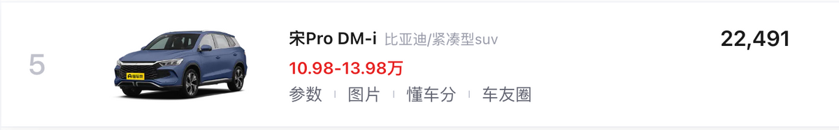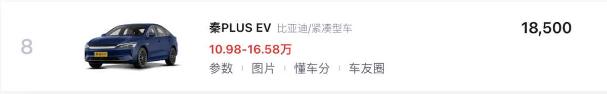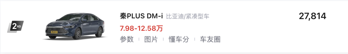 同時,秦PLUS家族雙動力車型都進入到了TOP10,其中,比亞迪秦PLUS DM-i(第02名/7.98-14.28萬元)以高效的超級混動和更低門檻,帶來了無里程焦慮的駕駛體驗,而比亞迪秦PLUS EV(第08名/10.98-13.98萬元)則與同步推出榮耀版的比亞迪驅逐艦05(第06名/7.98-12.88萬元)一起完成了對于緊湊型新能源轎車市場的統治,而低門檻帶來的DiLink與DiPilot則成為了它迎合當下用車需求的加分項。