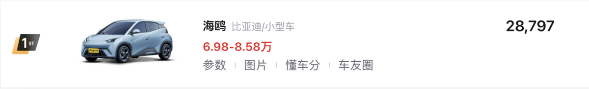 憑借著在小型車市場建立起來的關鍵優勢,比亞迪海鷗(第01名/萬元)順利奪冠,而且在本身就采用7萬級定價的情況下,榮耀版讓車輛的價格進一步下探。同時,車輛依舊支持DiLink等關鍵車載系統,配合運動風格座椅,綜合用車體驗還是比較出色的。