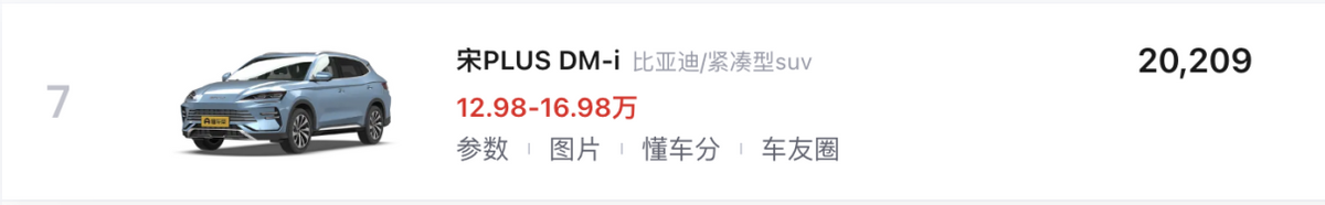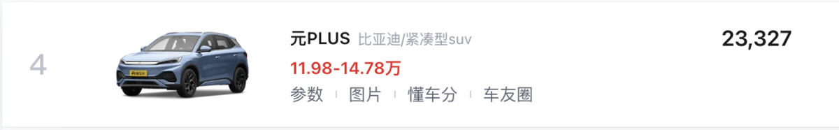 比亞迪元PLUS(第04名/11.98-16.38萬元)、比亞迪宋Pro DM-i(第05名/10.98-15.98萬元)、比亞迪宋PLUS DM-i(第07名/12.98-18.98萬元)三款比亞迪SUV共同分享了三個名次,三者的名次剛好與定位相悖,排序從高到低,三款車都在過去兩年完成了重要改款,并在今年加入到了榮耀版陣容當中,最大門檻降幅達到了3萬元,其中,完成了e平臺3.0 SUV首秀的元PLUS更是覆蓋了八合一電驅、CTB車身電池一體化、寬溫域高效熱泵等一系列領先技術,在綜合效能上達成了低價高能。
