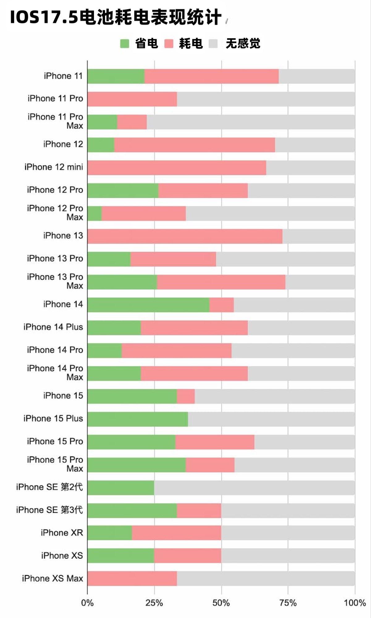 從網友體驗的iOS 17.5系統統計出的數據來分析電池續航,該份數據是真實iPhone用戶在升級體驗得出的統計結果,可得出在升級 iOS 17.5 感覺明顯省電機型分別為 iPhone 14、iPhone 15、iPhone 15 Plus、iPhone 15 Pro、iPhone 15 Pro Max、iPhone SE 3 。