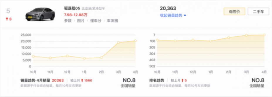 而在A級轎車市場中,同時推出并上市榮耀版的秦PLUS DM-i(7.98-14.28萬元)、驅逐艦05(7.98-12.88萬元)、秦PLUS EV(10.98-13.98萬元)也分別拿下了第二名、第五名、第六名的好成績,在整個轎車市場TOP10之中為比亞迪奪下了一共4個名額,從95474輛的整體銷售數據上看也真正意義上占據轎車市場TOP10的“半壁江山”(轎車市場TOP10整體銷售量為199812輛)。