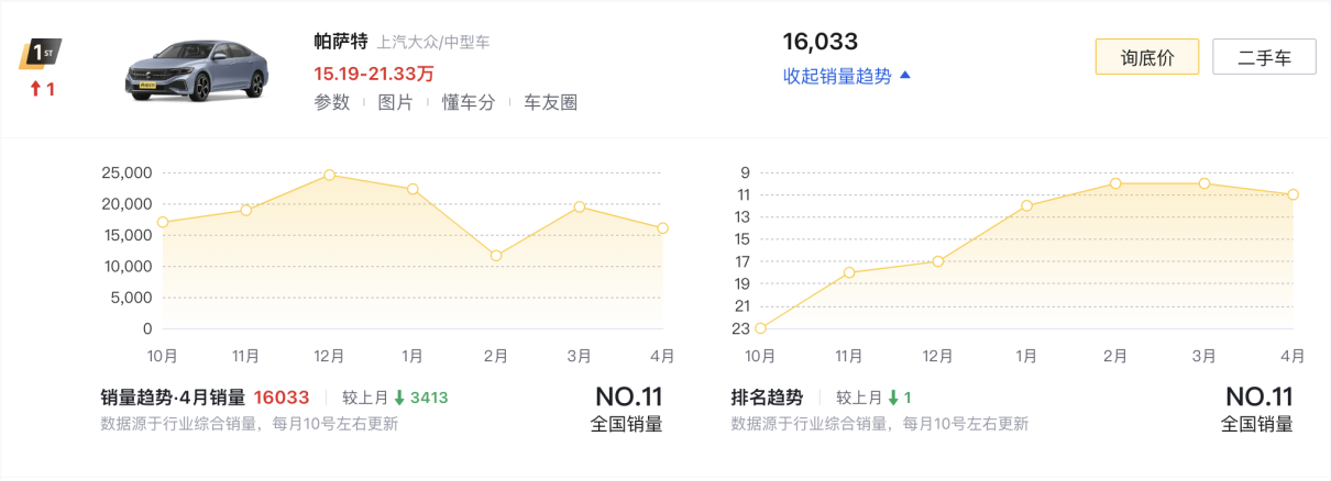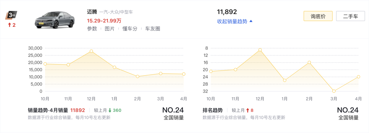 隨著經(jīng)營環(huán)境與國內(nèi)市場價(jià)格戰(zhàn)等狀況的出現(xiàn),特斯拉Model 3出現(xiàn)了大幅下挫,大量持幣待購的用戶使得其難以兌現(xiàn)產(chǎn)品優(yōu)勢,最終未能進(jìn)入到前十。而在中型車市場冠軍位置上取代特斯拉的,便是大眾帕薩特(18.19-24.33萬元),這款老牌勁旅在2024年的前4個(gè)月中三次奪冠,其號召力可見一斑。除了大眾所帶來的高質(zhì)量核心三大件之外,隨著新一代車型發(fā)布而帶來的舊款大幅優(yōu)惠,也是大量用戶在近期進(jìn)行抄底入手的關(guān)鍵。
