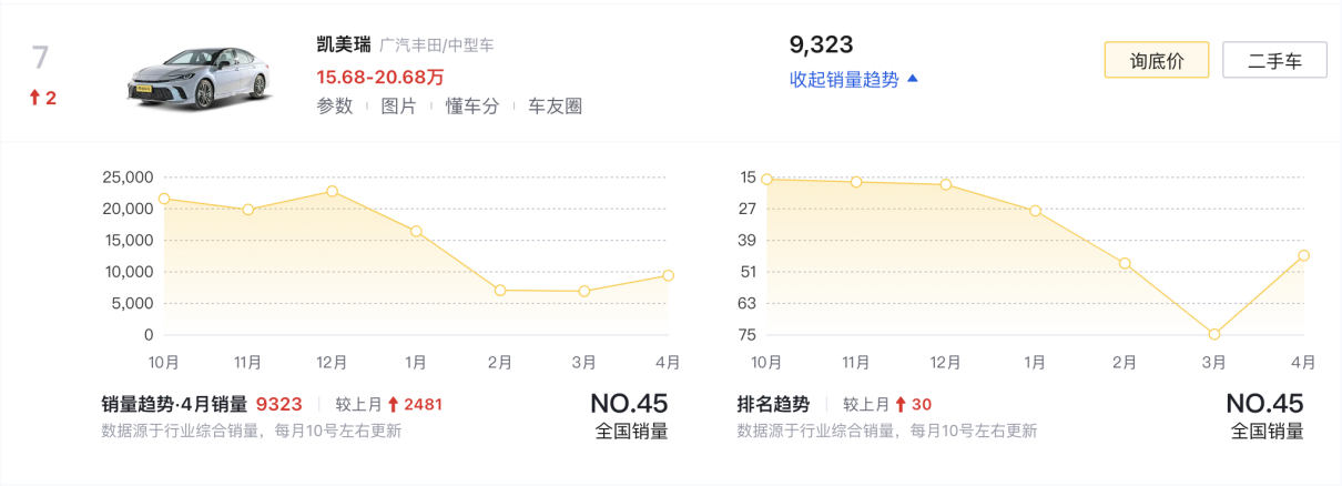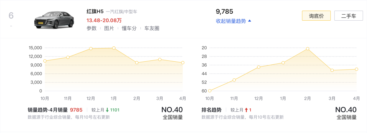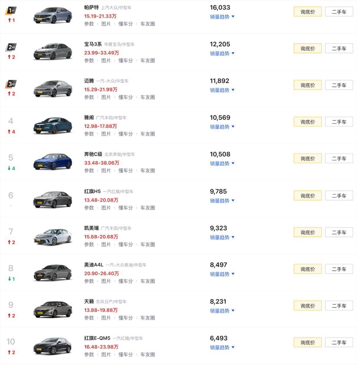 4月中型車銷量榜TOP10盤點(diǎn):紅旗H5反超凱美瑞,帕薩特奪得銷冠