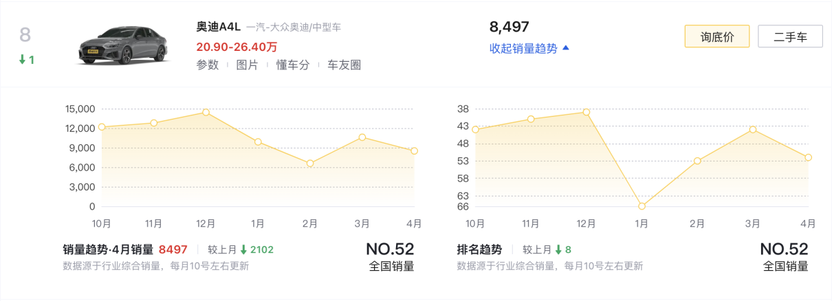 而奔馳C級、奧迪A4L雖然擁有更大力度的終端優(yōu)惠,但由于寶馬3系在上一次迭代中實(shí)現(xiàn)了大幅度舒適性優(yōu)化,這使得奔馳C級的優(yōu)惠幅度大不如前。而且其對于經(jīng)濟(jì)性的偏向,使得它在動力性能上也比不上寶馬3系。至于說奧迪A4L,遲遲未能換代使得它的內(nèi)外設(shè)計(jì)與車載智能都被兩位對手遠(yuǎn)遠(yuǎn)甩開,空有直線上的性能優(yōu)勢卻無法再建立起綜合競爭優(yōu)勢,賣不贏“3C”也就不奇怪了。