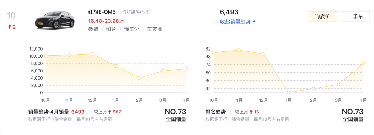 在中型轎車TOP10之中,唯一的新能源車型不是來自新勢力或新品牌,而是來自紅旗的紅旗E-QM5(16.58-23.98萬元),它排在了第10名。不過,這款車型是一臺比較特殊的商務(wù)用車,它更多服務(wù)于公共出行領(lǐng)域,換句話說,就是與一些出行科技公司合作的大單采購,主打空間舒適,家庭選擇它的少之又少。不過,隨著它在過去兩年改款中,通過PLUS車型帶來了大幅巡航提升,又更新了特供公共出行市場的出行版,這銷售量增長便是來自于此。