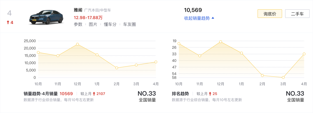 在傳統(tǒng)中型車市場冠軍陣容里,本田雅閣(17.18-20.68萬元)與豐田凱美瑞(17.98-22.88萬元)分別排在第4名、第7名,由于雅閣率先完成換代,新一代車型已經(jīng)逐漸完成了終端市場的優(yōu)惠價(jià)格提高,而剛剛完成換代的豐田凱美瑞也像Model 3一樣遭遇著持幣待購的情況,這也使得雅閣在前4個(gè)月重新取得了在老對手面前的競爭優(yōu)勢。不過,隨著凱美瑞進(jìn)入到更具“電氣化”風(fēng)格的新一代,其從智能到效能都將再度提升,等到新一代車型降價(jià),恐怕雅閣就懸了。