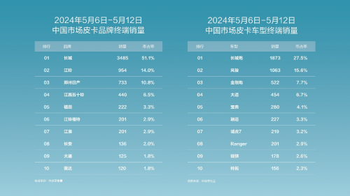日前,長城皮卡公布五月第二周銷量數(shù)據(jù)。5月6日-12日,長城皮卡國內(nèi)銷售3485輛,國內(nèi)終端市占率達(dá)51%,再創(chuàng)新高。長城炮、風(fēng)駿、金剛炮更是斬獲皮卡市場單車型銷量前三。