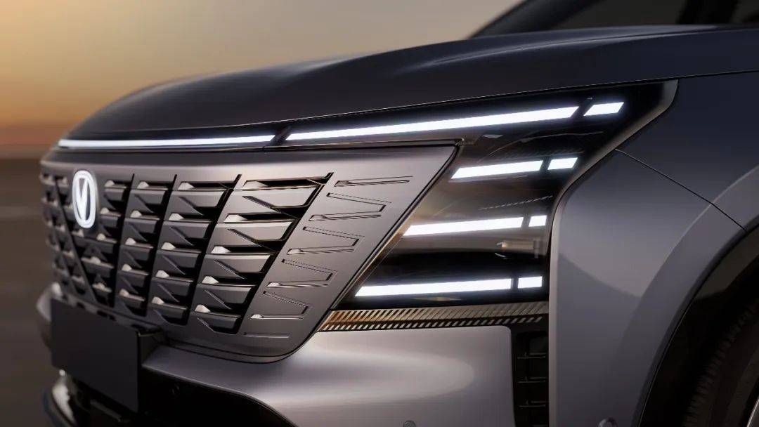 前燈飽滿且與整車呼應,貫穿式天際線大燈增加了新車前臉的層次感,更加挺拔凌厲。日行燈與前格柵橫向的孔隙連成一體,形成強烈的橫向張力,營造出穩健大氣、自信挺拔的既視感。而格柵內部的點陣式結構與可發光的長安V標相呼應,又展現出獨特的科技感。