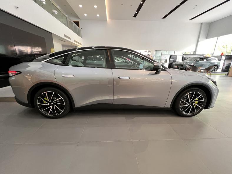 車長4.8米出頭,側面看十分流線, 典型的轎跑設計手法,并采用黑化車頂的設計,看起來還挺時尚的。