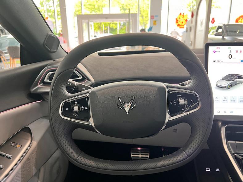 方向盤采用上下平底的設計,上面削平可以減少查看HUD信息的遮擋,下方削平是體驗運動的慣用手法。方向盤還做了打孔處理,握感還行。