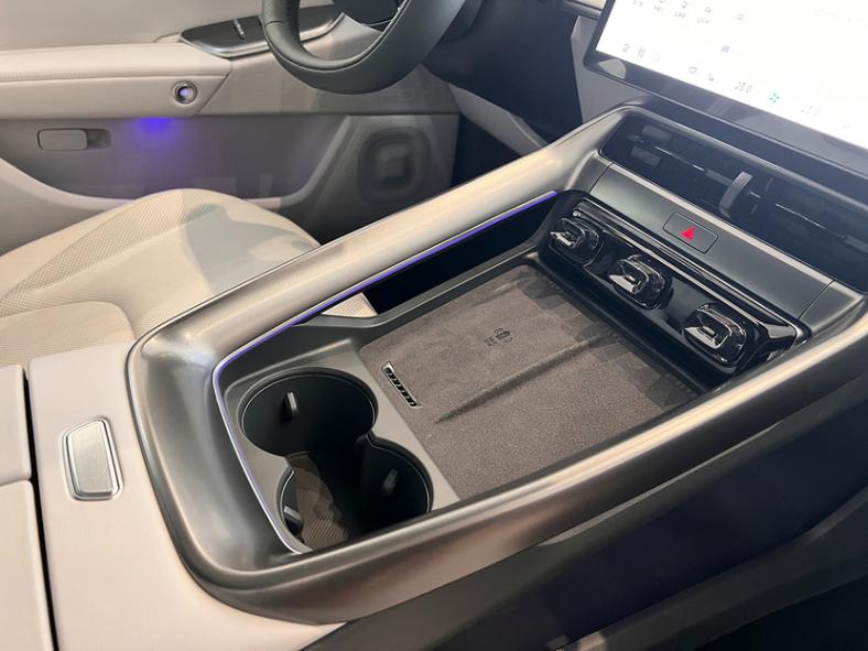 中控屏下方從前到后分別是空調出風口、香氛系統、手機無線充電和杯架。